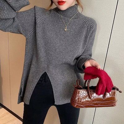 【2枚購入で 3oo円OFF!】秋冬新作 韓国ファッション 無地 ニット スリット 3カラー セーター ハイネック 厚手 リブニット トップス ニット レディース ニット カシミヤタッチ 福袋