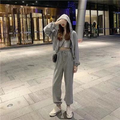 【2枚購入で 2oo円OFF! 】おしゃれスリーピース女装です運動着です無地カジュアルフード付きパーカーです運動セット女です