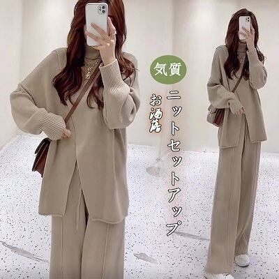 秋冬 ファッションセットアップ おしゃれ 気質 レディース ニット アウター 二点セット 上下セット セーター ワイドパンツ セットアップ 通勤 シンプル 福袋