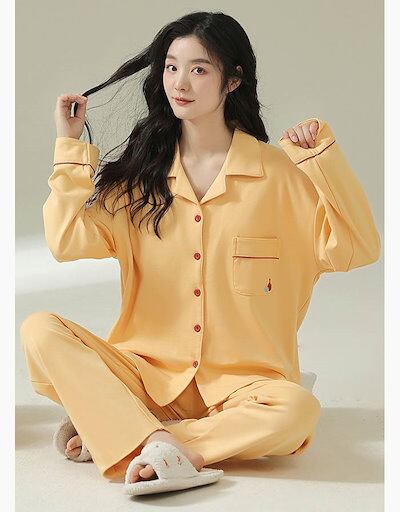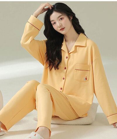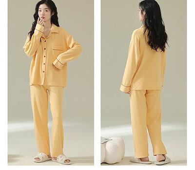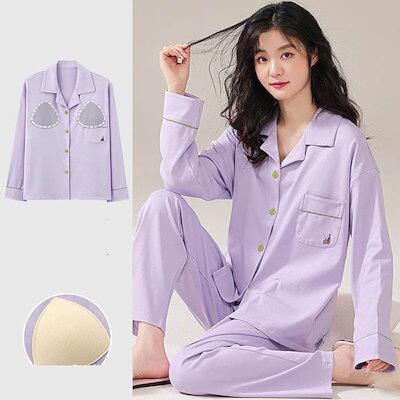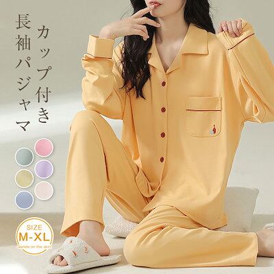 パジャマ レディース 長袖 無地 ルームウェア 2点セット カップ付き パット ロングパンツ 長ズボン 前開き 上下セット 春秋 コットン 寝間着 おしゃれ 可愛い シンプル ゆったり 大きいサイズ