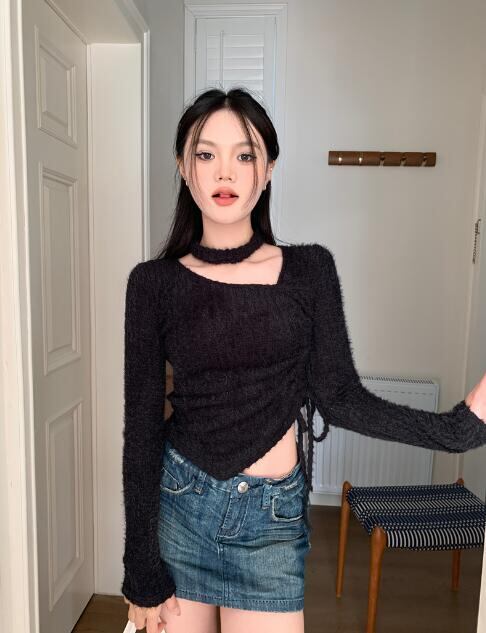 3色ニットトップスカットソー長袖ショート丈