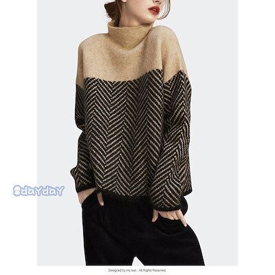 ニットセーター レディース 秋冬 40代 長袖トップス 配色セーター ハイネック ニットインナー 丈 プルオーバー ゆったり 韓国風 オシャレ カジュアル
