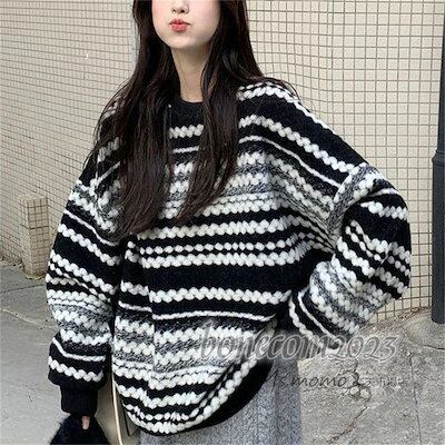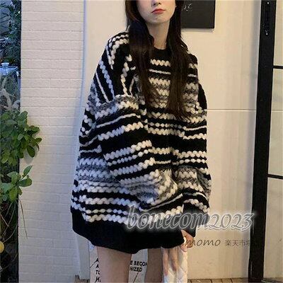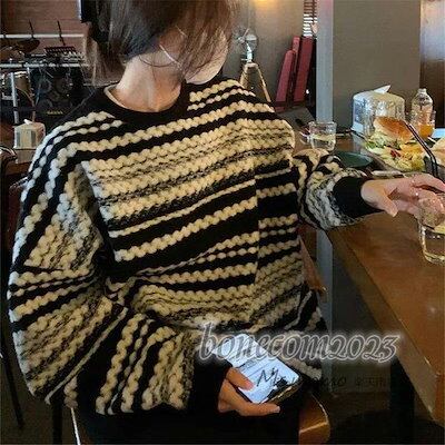 ニットトップス レディース 秋冬30代長袖セーター ボーダー柄 丈セーター ゆったりプルオーバー オシャレ韓国風 カジュアル 大人ニットインナー