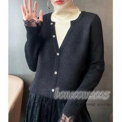 ニットトップス レディース 秋冬30代長袖セーター配色 レース ハイネック 丈セーター ゆったりプルオーバー オシャレ韓国風 大人ニットインナー