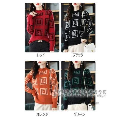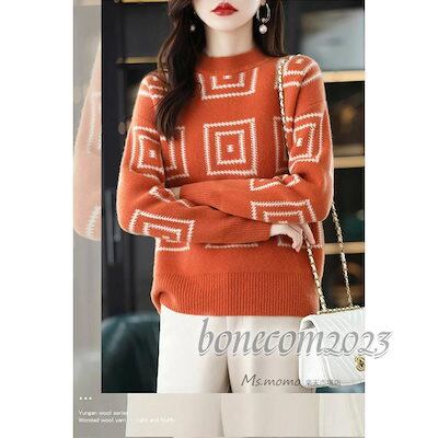 ニットトップス レディース 秋冬30代長袖セーター 配色 幾何 丈セーター ゆったりプルオーバー オシャレ韓国風 大人ニットインナー