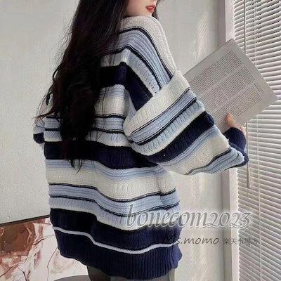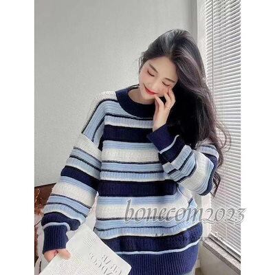 ニットトップス レディース 秋冬30代長袖セーター ボーダー柄 丈セーター ゆったりプルオーバー オシャレ韓国風 大人ニットインナー 厚手