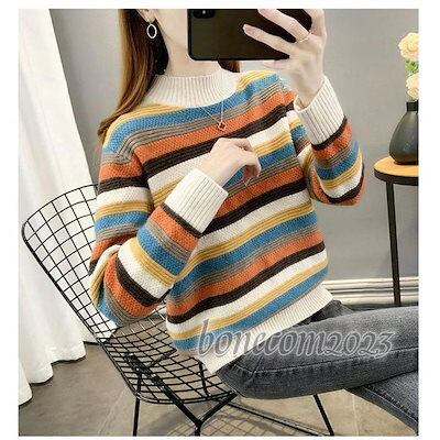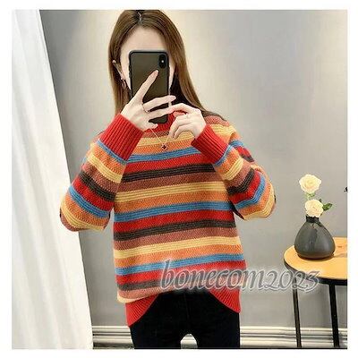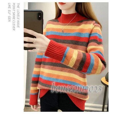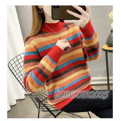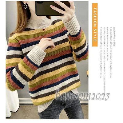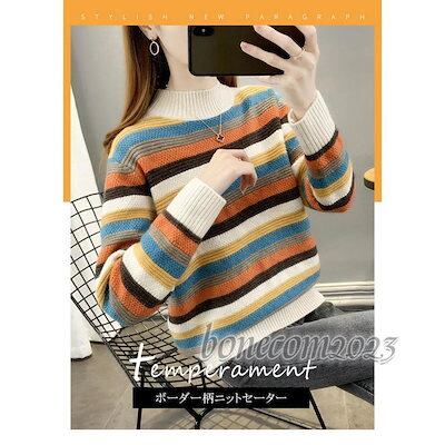 ニットトップス レディース 秋冬30代長袖セーター ハイネック ボーダー柄 丈セーター ゆったりプルオーバー オシャレ韓国風 大人ニットインナー 厚手