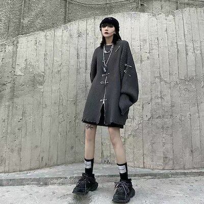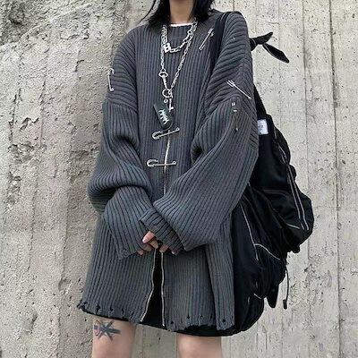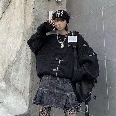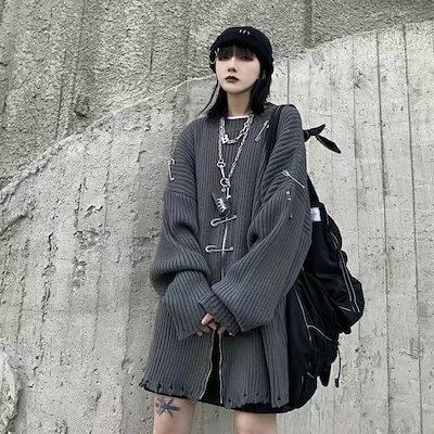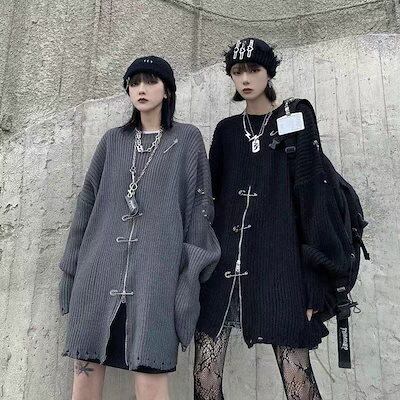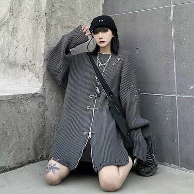 ニットセーター 韓国ファッション ニット レディース ダメージ加工 オーバーサイズ セーター ロング丈 原宿系 地雷系 ユニセックス ニットトップス 秋冬 大きめ