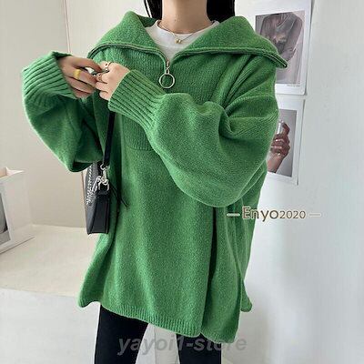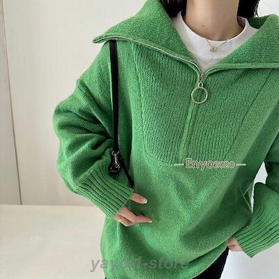 ニット ハーフジップ プルオーバー レディース セーター トップス ハイネック タートルネック 秋冬 長袖 ボリューム袖 ジップ リブ スリット 大きいサイズ 韓国