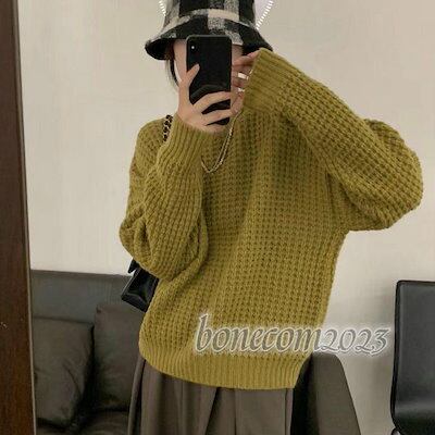 レディース 韓国ファッション ニット セーター クルーネック ざっくり ゆるシルエット 長袖 トップス カジュアル 大人女子 秋冬 デイリー 普段着 カーキ