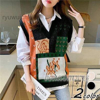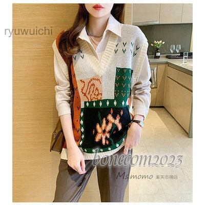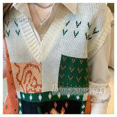 ニットベスト レディース春秋冬 ベストセーター ノースリープ プリント Vネックニットベストプルオーバー カジュアル韓国風 ゆったり 通勤 着痩せ 体型カ