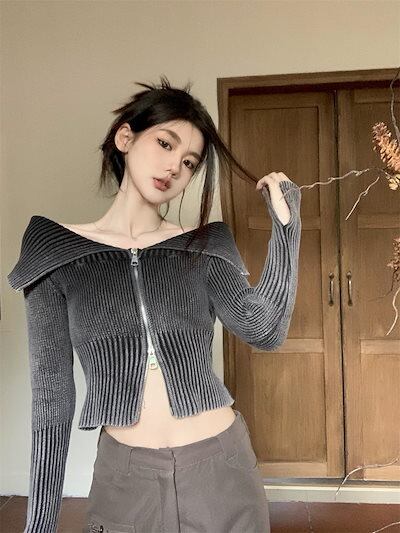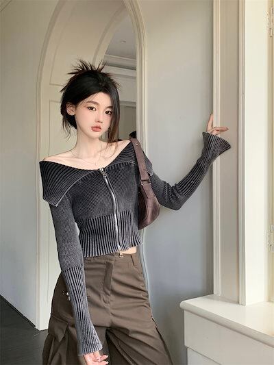 2024秋冬トップス 長袖 ニット 韓国トレンドコーデ セーター おしゃれ 色っぽ 女っぽスタンド丈カジュアルアップ きれいめ大人系ファッションレディース加工アップフェミニン フレンチダブル