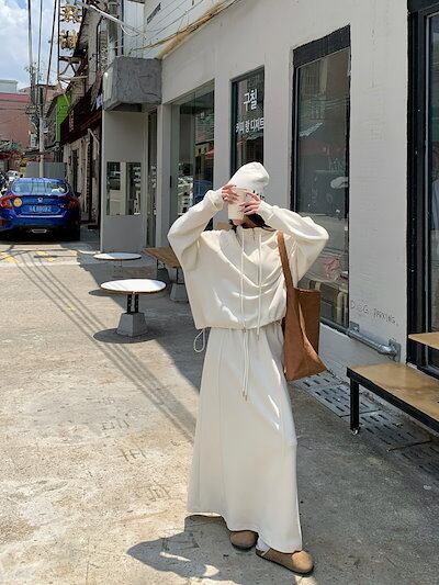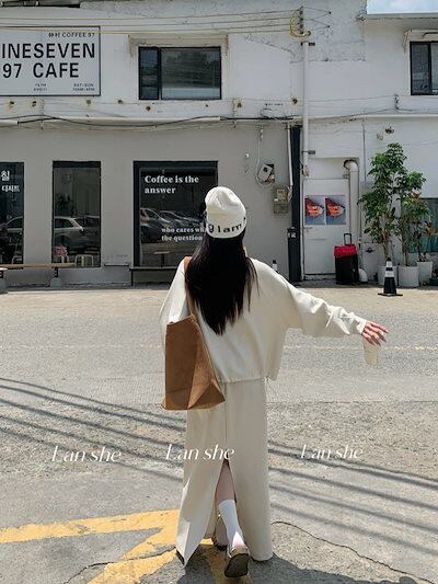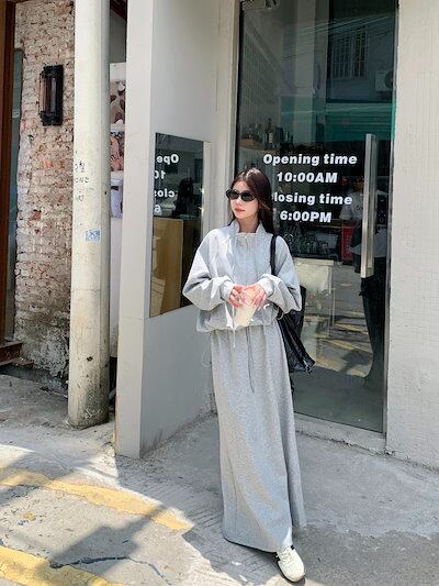 2024 秋冬 韓国 かわいい レディース無地ハイネック長袖アウターレトロセット黑白フーディーハーフサイズ丈トップス春カジュアルスポーツファッション系通学学生袖お出かけアップシルエットトラックロング