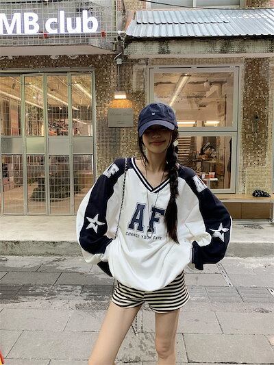 2024秋冬トップスバイカラー長袖TシャツかわいいK-POPレディース韓国風ロゴ衣装ルーズゆったりカジュアルおしゃれサイズ袖グラフィックシルエットファッション系サイドシャツフット春スポーツVネックT