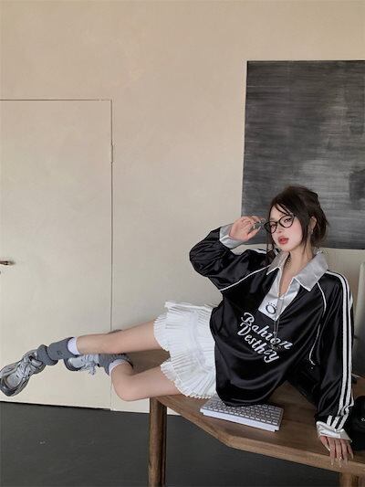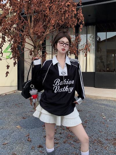 2024秋冬 トップスバイカラー長袖TシャツかわいいK-POP黑白レディース韓国風ロゴ衣装ルーズゆったりカジュアルおしゃれサイズ袖グラフィックシルエットファッション系サイドシャツフット春VスポーツT