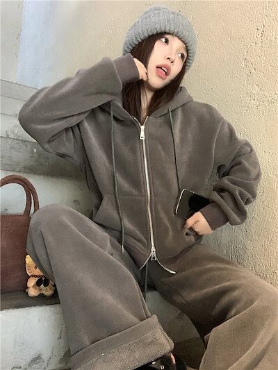 2024秋冬 韓国 かわいい レディース 無地 フード付き長袖アウターレトロセット黑白フーディーダブルサイズ丈トップス春カジュアルスポーツファッション系通学学生袖お出かけアップシルエットトラック羽織り