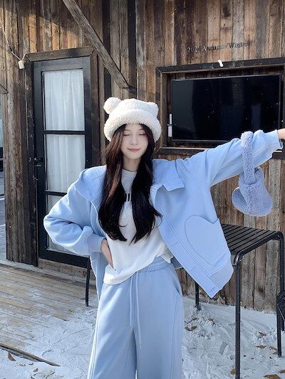 2024 秋冬 韓国 かわいい レディース 無地 ハイネック長袖アウターレトロセット黑白フーディーブルサイズ丈トップス春カジュアルスポーツファッション系通学学生袖お出かけアップシルエットトラック
