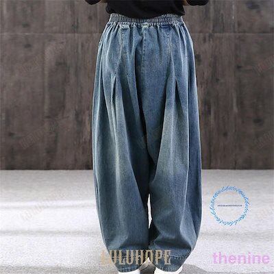 ワイドパンツ レディース デニム ジーンズ サルンツ おしゃれ ウゴム 大きい ゆったり カジュアル 春 秋 体型カバー 50代