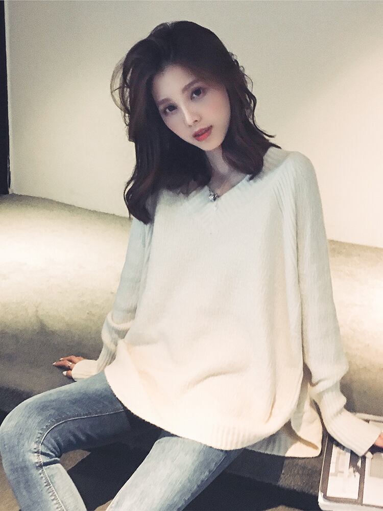 ニット Vネック トップス プルオーバー ヤク風 ラグランスリーブ ロング丈 ストレッチ チュニック