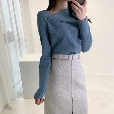 デザインネック プルオーバー ニット 3色 レディース トップス 長袖 スリム かわいい きれいめ おしゃれ 春 秋 通勤 デート お出かけ 休日 ショッピング お花見 フリーサイズ ホワイト