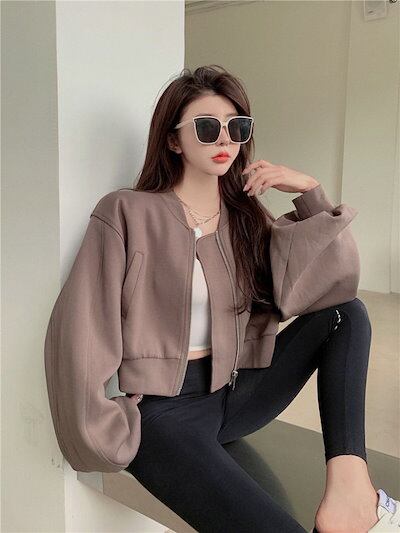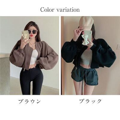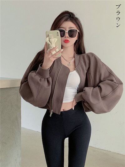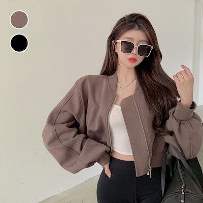 ノーカラー パフスリーブ ショート ジャケット ジップアップ シンプル 無地 カジュアル きれいめ 秋冬 おすすめ レディース オシャレ トレンド 人気 プチプラ 韓国ファッション