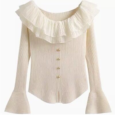 レディース トップス カットソー ニット セーター ライダースジャケット フレアスリーブ フリル袖 ラウンドネック スリム 細身 フェミニン 前開き 伸縮性 ボタン かわいい 大人可愛い きれいめ