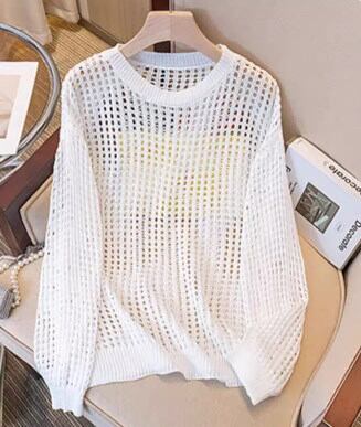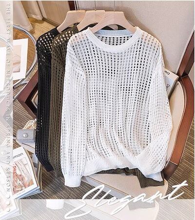 レディース トップス ニット セーター プルオーバー ラウンドネック ストレート オーバーサイズ クロシェ 透け感 薄手 きれいめ シンプル カジュアル 上品 おしゃれ かっこいい こなれ感 ラフ