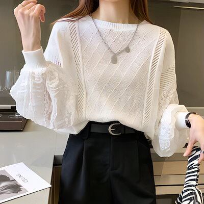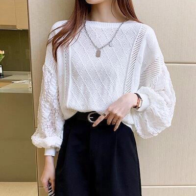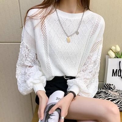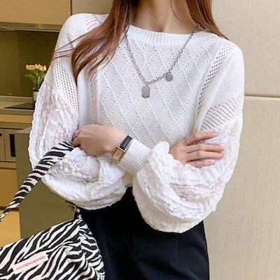 春と秋スタイルのアウターウェア ルーズスプライスレースのTシャツ レディース トップス ロンT セーター アウター 長袖 パフスリーブ ラウンドネック 襟なし ノーカラー ワイド ストレート