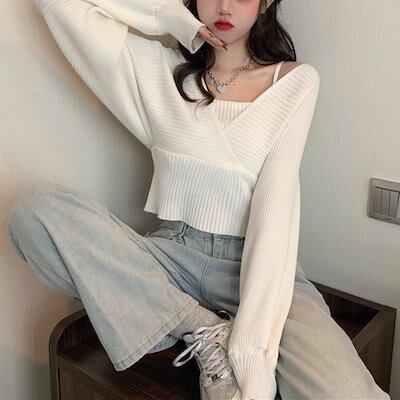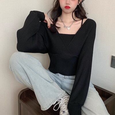 全5色 フロントクロスセーター レディース トップス ニット セーター 長袖 パフスリーブ ラグラン 肩出し Vネック スクエアネック オフショルダー ワンショルダー セミフレア 細身 アシンメトリー