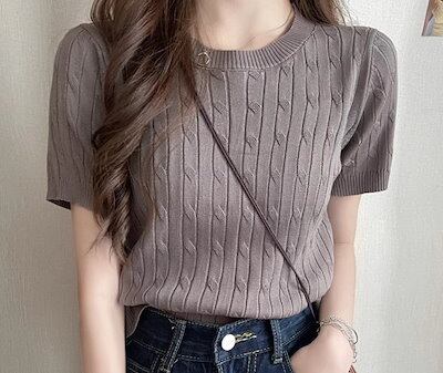 レディース トップス カットソー ニット セーター プルオーバー サマーセーター サマーニット クロップド丈 半袖 ラウンドネック スリム 細身 フェミニン 薄手 かわいい 大人可愛い きれいめ