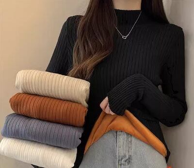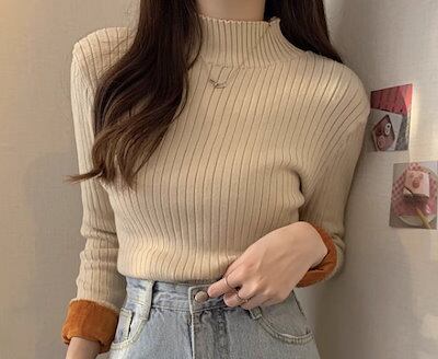 レディース トップス ニット セーター プルオーバー ミドル丈 長袖 ハイネック 細身 ストレート 厚手 裏起毛 ベルベット ストレッチ 伸縮性 大人可愛い きれいめ シンプル カジュアル 上品