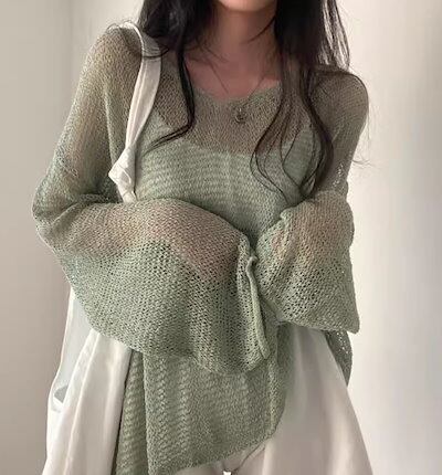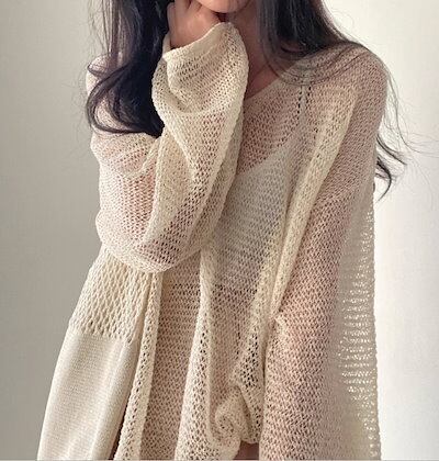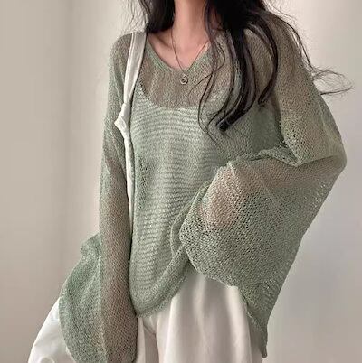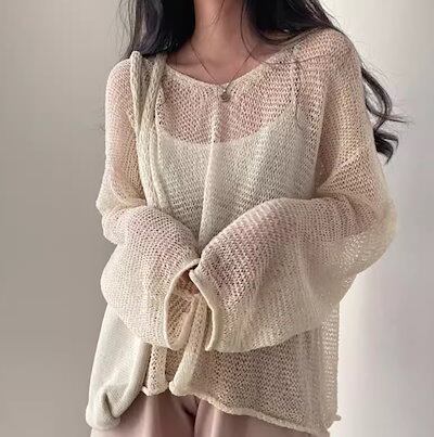 レディース トップス ニット セーター プルオーバー サマーニット ミドル丈 長袖 ドロップショルダー Vネック フェミニン 透け感 薄手 かわいい 大人可愛い きれいめ シンプル カジュアル
