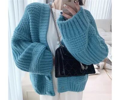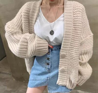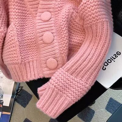 レディース トップス ニット カーディガン ミドル丈 長袖 ドロップショルダー Vネック フェミニン 前開き ボタン 厚手 かわいい 大人可愛い シンプル カジュアル おしゃれ レトロ こなれ感