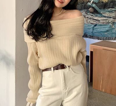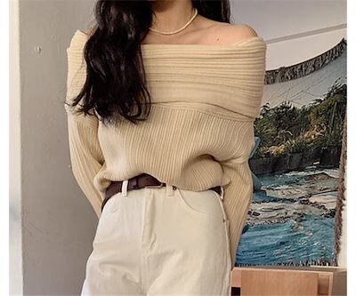 レディース トップス ニット セーター プルオーバー ミドル丈 長袖 オフショルダー フェミニン 異国風 かわいい 大人可愛い きれいめ シンプル カジュアル おしゃれ こなれ感 ルーズ 抜け感