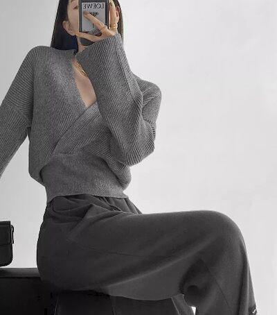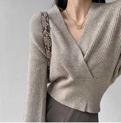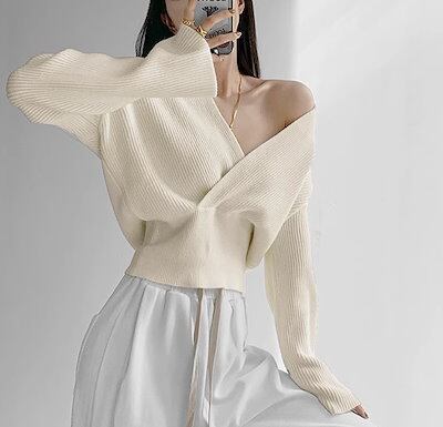 レディース トップス ニット セーター プルオーバー ショート クロップド丈 長袖 ドロップショルダー Vネック カシュクール ストレート ウエストマーク 厚手 大人可愛い きれいめ シンプル