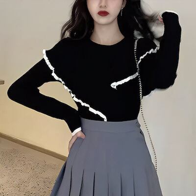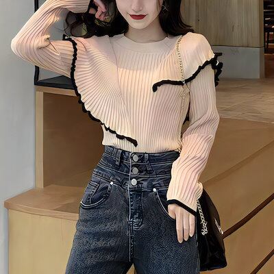 3色展開 フリル付きニット長袖セーター レディース トップス ロンT カットソー ニット セーター ミドル丈 レギュラースタイル 長袖 ラウンドネック スクープカラー スリム 細身 スリムフィット