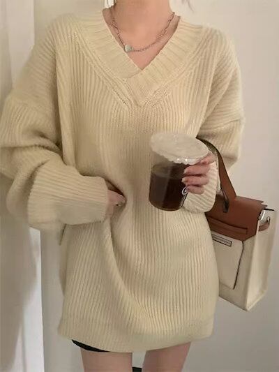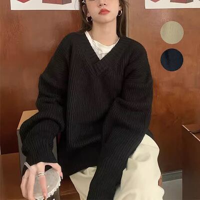 2色展開 デザインニッチ/Vネック長袖セーター レディース トップス ニット セーター アウター ロング 長袖 Vネック ストレート ヘッジ オーバーサイズ フェミニン ふっくら リブニット