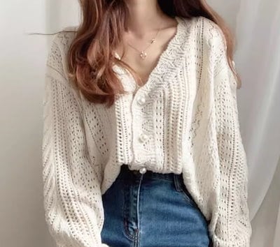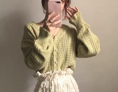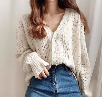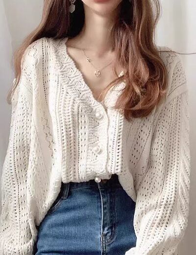 レディース トップス ニット セーター カーディガン ウール ミドル丈 長袖 Vネック フェミニン かぎ針編み 透かし編み かわいい 大人可愛い きれいめ シンプル カジュアル 上品 おしゃれ