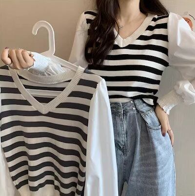 レディース トップス ニット セーター プルオーバー ミドル丈 長袖 ボリューム袖 バルーン袖 ランタンスリーブ Vネック フェミニン フリル 切り替えデザイン ドッキング ストレッチ 伸縮性