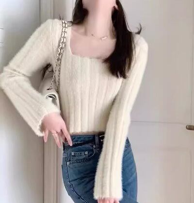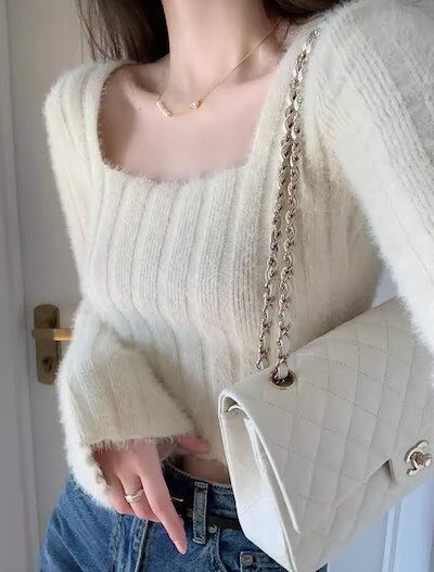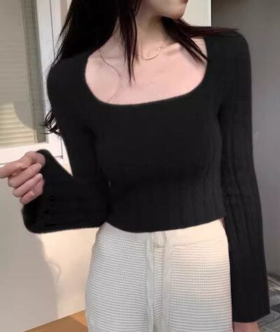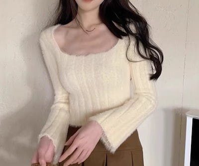 レディース インナー トップス ニット セーター プルオーバー ショート クロップド丈 長袖 スクエアネック タイト スリム 細身 フェミニン ストレッチ 伸縮性 かわいい 大人可愛い きれいめ
