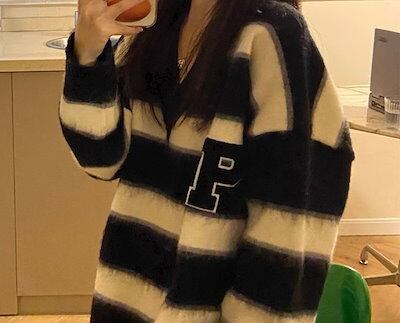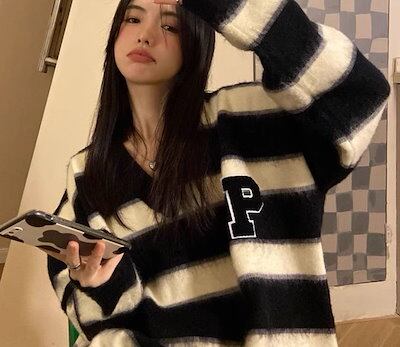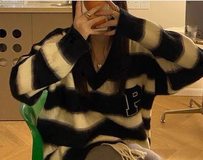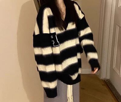 レディース トップス ニット セーター プルオーバー ミドル丈 長袖 Vネック かわいい カジュアル おしゃれ かっこいい レトロ ラフ ボーイッシュ ルーズ 個性的 クール 存在感 キュート