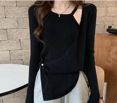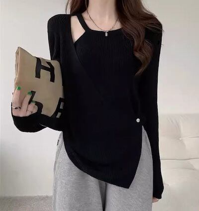 重ね着風 フェイクツーピース レディース トップス ニット セーター プルオーバー ショート 長袖 スリム 細身 大人可愛い きれいめ シンプル カジュアル 上品 おしゃれ かっこいい こなれ感 ラフ