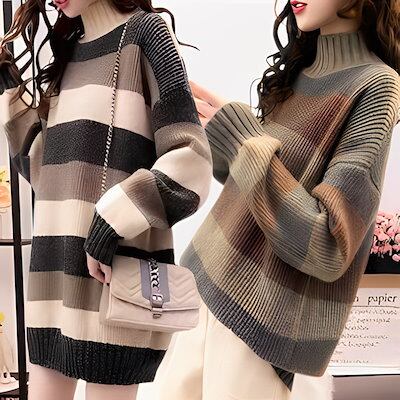 2色展開 ルーズなミッドレングスのハーフタートルネックセーター レディース トップス ニット セーター プルオーバー アウター 丈長 長袖 萌袖 ハイネック ワイド ストレート 伸縮性 バイカラー