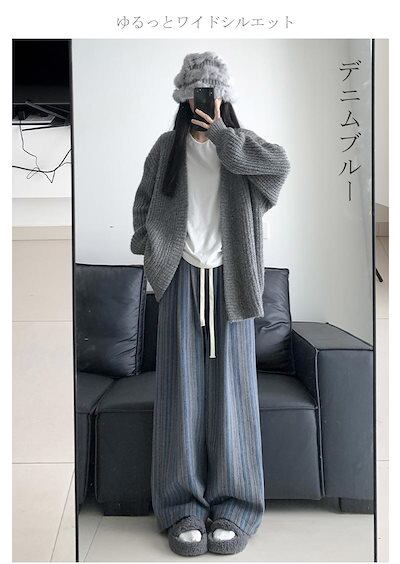 ストレートパンツ ワイドパンツ レディース カラバリ裏起毛 ストライプ ウェストゴム 体型カバー パンツ ボトムス ゆったり イージーパンツ フレアパンツ ハイウェスト もこもこ ロング ロングパン