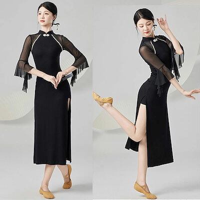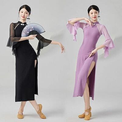 ダンスワンピース 古典ダンス衣装 レディースダンスウェア フレア袖 スリット入り ショートパンツ付き 透け感 ダンス ワンピース チャイナドレス レッスン着 舞台 ステージ 練功服 練習着 発表会 傘