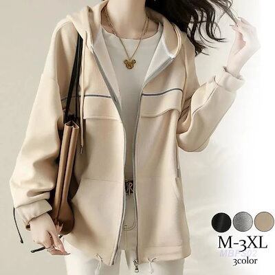 パーカー ジップアップパーカー レディース 長袖 前開き フード付き トップス アウター 無地 カジュアル ゆったり シンプル エレガント 上品 春秋