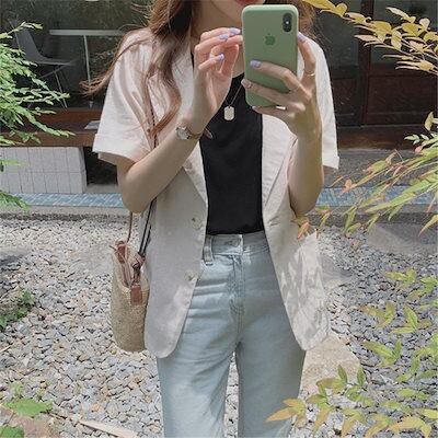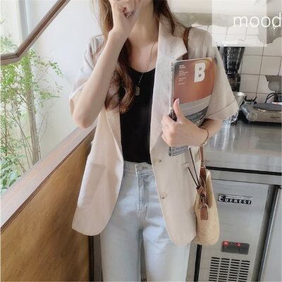 綿麻 スーツジャケット 2023春 レディース ゆったり 半袖 アウター トップス 韓国ファッション トップス