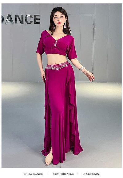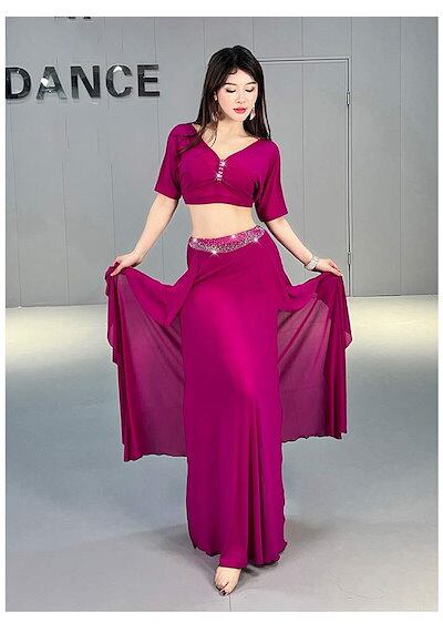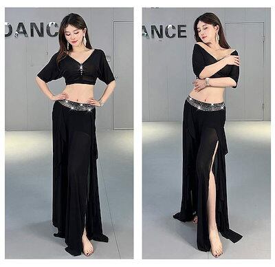 ダンス衣装 ロング丈スカート セットアップ ストレッチメッシュ 2点セット レディース レッスンウェア ベリーダンス 上下セット スリットオーバー 衣装 半袖 レッスン着 半袖トップス 社交ダンス ス