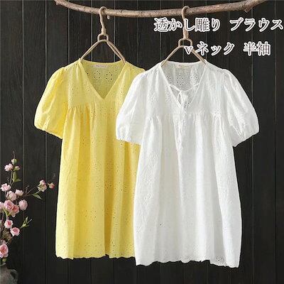 ブラウス レディース 綿 半袖ブラウス 半袖 透かし彫り タック シャツブラウス vネック リボン シャツ 刺繍 夏 プルオーバー Tシャツ 透け感 コットン トップス 無地 ホワイト 体型カバー ゆ