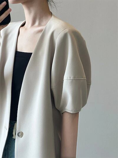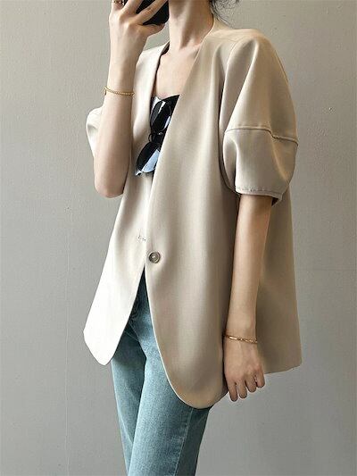 ジャケット ノーカラー レディース 春夏 テーラードジャケット 半袖 おしゃれ サマージャケット ボリューム袖 トップス ゆったり 体型カバー 半袖ジャケット カーディガン 夏 薄手 通勤 羽織り シ
